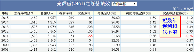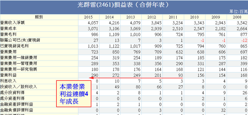 如果純看稅後獲利和EPS,2461光群雷射過去幾年獲利起伏不定表現平平。但如果只看營業利益這一項,其實光群雷射已經連續4年本業的營業利益持續成長,只是因為被匯兌損失、轉投資等業外支出拖累影響獲利表現。今年2016年上半年也有同樣的情形,稅後EPS只有0.44元,以它9/23的收盤價17.1元來看獲利不怎麼樣。但如果仔細一看營業利益1.8億其實較去年同期1.08億大幅成長66%,但不含其他業外支出,光只匯損這一項就達4200萬元約影響EPS0.3元。